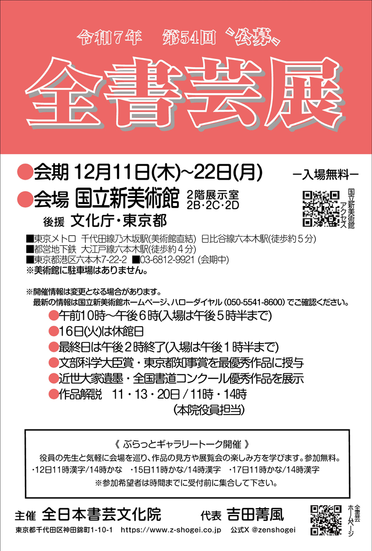 • 2025/6/12 2025年度 第54回全書芸展の公募出品要項(9月29日作品締切)を発表しました